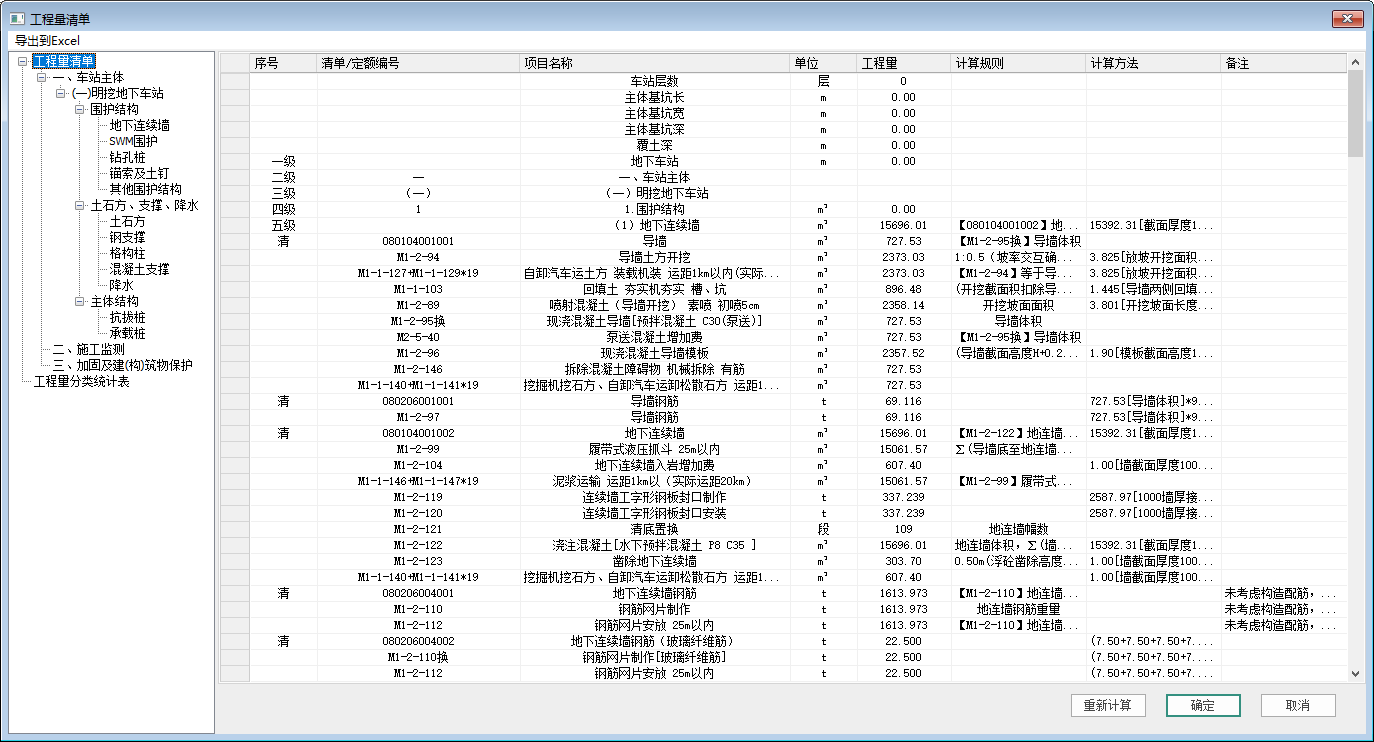 目录 搜索 展开 首页版权与商标说明免责声明第1章 功能特点与界面1.1 功能特点1.2 程序启动界面1.3 用户操作界面1.3.1 操作界面布局1.3.2 项目浏览器及属性栏1.3.3 捕捉工具及追踪面板1.3.4 模型显示调整1.3.5 快捷按钮第2章 结构建模2.1 轴网2.1.1 绘制轴网2.1.2 单根轴线2.2 图纸识别2.2.1 导入DWG2.2.2 调整DWG2.2.3 删除DWG2.2.4 图纸识别2.3 轮廓线2.3.1 轮廓绘制2.3.2 两点布置2.3.3 内外切换2.4 标高表2.6 分区编辑2.6.1 分区打断2.6.2 分区合并2.7 支护构件2.7.1 排桩2.7.2 双排桩2.7.3 地下连续墙2.7.4 SMW工法桩2.7.5 放坡2.7.6 钢板桩2.7.7 冠梁2.7.8 腰梁2.7.9 板撑2.7.10 支撑2.7.11 米字撑2.7.12 锚索/杆2.7.13 联系梁2.7.14 立柱2.7.15 铺盖2.7.16 挡墙2.7.17 导墙2.7.18 排水沟2.7.19 剪刀撑2.7.20 土钉2.8 加固/防水措施2.8.1 加固区定义2.8.2 满堂加固2.8.3 抽条加固2.8.4 换填加固2.8.5 槽壁加固2.8.6 桩间止水帷幕2.8.7 通用止水帷幕2.8.8 降水井2.9 分幅编辑2.9.1 构件分幅2.9.2 分幅调整2.9.3 分幅删除2.10 层间编辑2.10.1 层间复制2.11 材料2.11.1 材料信息2.11.2 交互修改2.12 构件筛选器2.5 基底设置2.5.1 区域划分2.5.2 坡度设置2.5.3 坑中坑第3章 地质基础3.1 坐标转换3.1.1 坐标转换3.2 岩土参数3.2.1 岩土参数3.3 钻孔信息3.3.1 钻孔坐标3.3.2 钻孔柱状图3.3.3 钻孔柱状图显示3.4 地基基础3.4.1 立柱桩布置3.4.2 抗拔桩布置3.4.3 承载桩布置3.4.4 承台布置第4章 计算分析4.1 参数管理4.1.1 总参定义4.1.2 剖切截面4.1.3 录入计算结果4.2 计算工具集4.2.1 冠腰梁计算4.2.2 支撑计算4.2.3 连续钢梁验算4.2.4 钢支撑验算4.2.5 钢立柱验算4.2.6 铺盖计算4.2.7 挡墙计算4.2.8 基础工具箱4.3 设计结果4.3.1 地连墙配筋修改4.3.2 地连墙配筋表4.3.3 排桩配筋参数修改4.3.4 排桩配筋表4.4 计算书4.4.1 计算书生成第5章 图纸清单5.1 图纸设置5.1.1 图纸参数5.1.2 图层设置5.2 围护结构施工图5.2.1 设计总说明5.2.2 剖切出图5.2.3 基坑监测平面图5.2.4 基坑监测剖面图5.2.5 施工图生成5.3 图纸管理5.3.1 总图编辑5.3.2 大样图管理5.3.3 监测点插入5.3.4 插图衬图5.3.5 衬图调整5.3.6 图纸导出DWG5.4 算量统计5.4.1 算量参数5.4.2 材料清单5.5 通用文字5.6 通用表格5.7 数据导出 暂无相关搜索结果! 5.4.2 材料清单 <br /> 点击【材料清单】,程序自动计算工程量,并弹出如图 5.4-2所示工程量清单对话框。对话框左侧为工程量清单和工程量分类统计表目录,右侧为工程量清单和工程量分类统计表表格。 【导出到Excel】:支持将表格导出为Excel文件; 【重新计算】:重新计算当前工程量; 【确定】:点击确定,保存工程量计算结果,并关闭软件; 【取消】:点击取消,本次修改不保存,对话框关闭。 图 5.4-2工程量清单