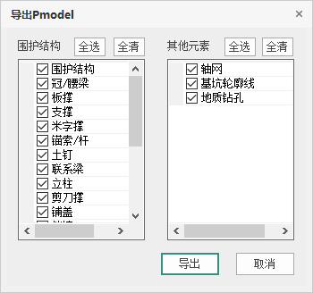 目录 搜索 展开 首页版权与商标说明免责声明第1章 功能特点与界面1.1 功能特点1.2 程序启动界面1.3 用户操作界面1.3.1 操作界面布局1.3.2 项目浏览器及属性栏1.3.3 捕捉工具及追踪面板1.3.4 模型显示调整1.3.5 快捷按钮第2章 结构建模2.1 轴网2.1.1 绘制轴网2.1.2 单根轴线2.2 图纸识别2.2.1 导入DWG2.2.2 调整DWG2.2.3 删除DWG2.2.4 图纸识别2.3 轮廓线2.3.1 轮廓绘制2.3.2 两点布置2.3.3 内外切换2.4 标高表2.6 分区编辑2.6.1 分区打断2.6.2 分区合并2.7 支护构件2.7.1 排桩2.7.2 双排桩2.7.3 地下连续墙2.7.4 SMW工法桩2.7.5 放坡2.7.6 钢板桩2.7.7 冠梁2.7.8 腰梁2.7.9 板撑2.7.10 支撑2.7.11 米字撑2.7.12 锚索/杆2.7.13 联系梁2.7.14 立柱2.7.15 铺盖2.7.16 挡墙2.7.17 导墙2.7.18 排水沟2.7.19 剪刀撑2.7.20 土钉2.8 加固/防水措施2.8.1 加固区定义2.8.2 满堂加固2.8.3 抽条加固2.8.4 换填加固2.8.5 槽壁加固2.8.6 桩间止水帷幕2.8.7 通用止水帷幕2.8.8 降水井2.9 分幅编辑2.9.1 构件分幅2.9.2 分幅调整2.9.3 分幅删除2.10 层间编辑2.10.1 层间复制2.11 材料2.11.1 材料信息2.11.2 交互修改2.12 构件筛选器2.5 基底设置2.5.1 区域划分2.5.2 坡度设置2.5.3 坑中坑第3章 地质基础3.1 坐标转换3.1.1 坐标转换3.2 岩土参数3.2.1 岩土参数3.3 钻孔信息3.3.1 钻孔坐标3.3.2 钻孔柱状图3.3.3 钻孔柱状图显示3.4 地基基础3.4.1 立柱桩布置3.4.2 抗拔桩布置3.4.3 承载桩布置3.4.4 承台布置第4章 计算分析4.1 参数管理4.1.1 总参定义4.1.2 剖切截面4.1.3 录入计算结果4.2 计算工具集4.2.1 冠腰梁计算4.2.2 支撑计算4.2.3 连续钢梁验算4.2.4 钢支撑验算4.2.5 钢立柱验算4.2.6 铺盖计算4.2.7 挡墙计算4.2.8 基础工具箱4.3 设计结果4.3.1 地连墙配筋修改4.3.2 地连墙配筋表4.3.3 排桩配筋参数修改4.3.4 排桩配筋表4.4 计算书4.4.1 计算书生成第5章 图纸清单5.1 图纸设置5.1.1 图纸参数5.1.2 图层设置5.2 围护结构施工图5.2.1 设计总说明5.2.2 剖切出图5.2.3 基坑监测平面图5.2.4 基坑监测剖面图5.2.5 施工图生成5.3 图纸管理5.3.1 总图编辑5.3.2 大样图管理5.3.3 监测点插入5.3.4 插图衬图5.3.5 衬图调整5.3.6 图纸导出DWG5.4 算量统计5.4.1 算量参数5.4.2 材料清单5.5 通用文字5.6 通用表格5.7 数据导出 暂无相关搜索结果! 5.7 数据导出 程序支持把三维模型导出.pmodel格式,以便进行后续的模型应用。同时支持用户自定义导出的构件类型。 图 5.7-1 数据导出对话框