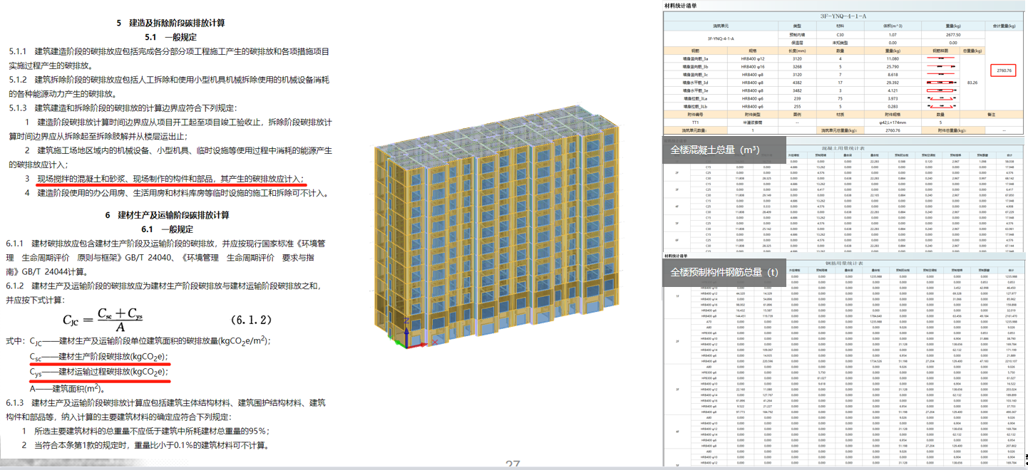 根据《建筑碳排放计算标准》GB/T 51366-2019相关要求,在计算建造及拆除阶段碳排放计算和建材生产及运输阶段碳排放计算时需要整栋建筑的现浇混凝土、预制构件混凝土、现场帮扎钢筋、预制构件钢筋量及部件的总量。PKPM-PC可快速导出.XDB文件,包括模型中构件的混凝土和钢筋量,辅助完成碳排放计算。