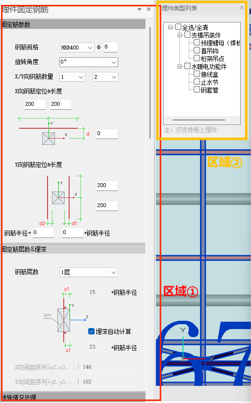 区域①对固定钢筋参数进行设置。