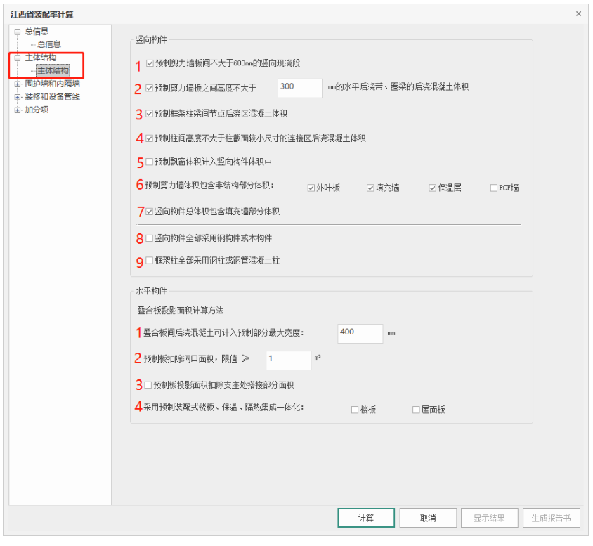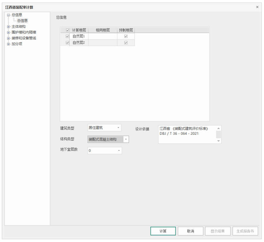 【设计依据】:默认填“《江西省装配式建筑评价标准》DBJ/T36-064-2021”可修改,此部分联动在word报告书中同步内容,不影响计算方法。