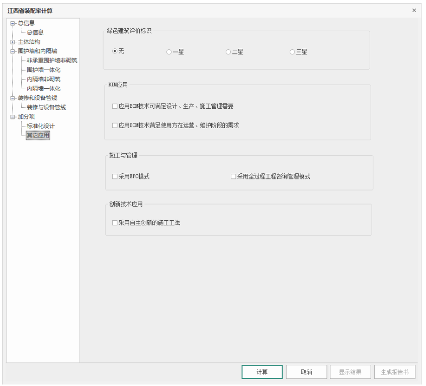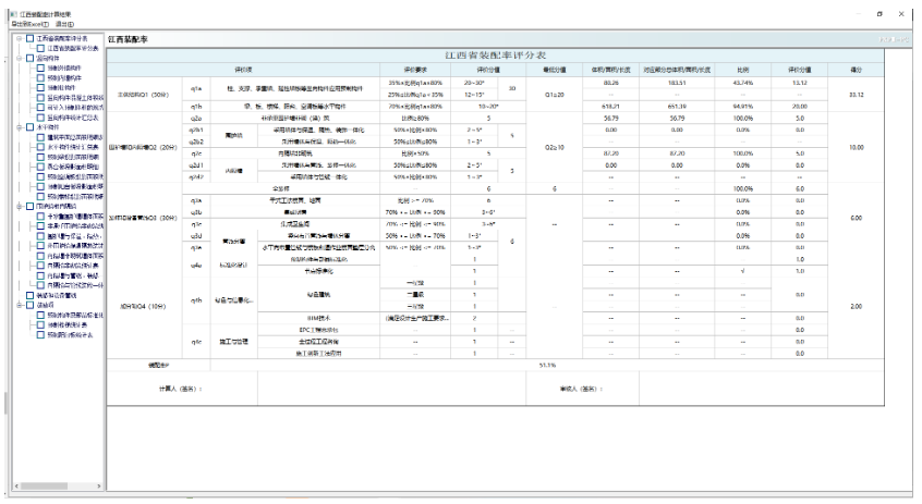 用户根据项目实际情况选择对应工艺做法,根据《江西省标》各项评分要求,得出最终结果。点击“计算”,直接输出各项结果,可查看和导出为EXCEL文件,功能启动界面如下: