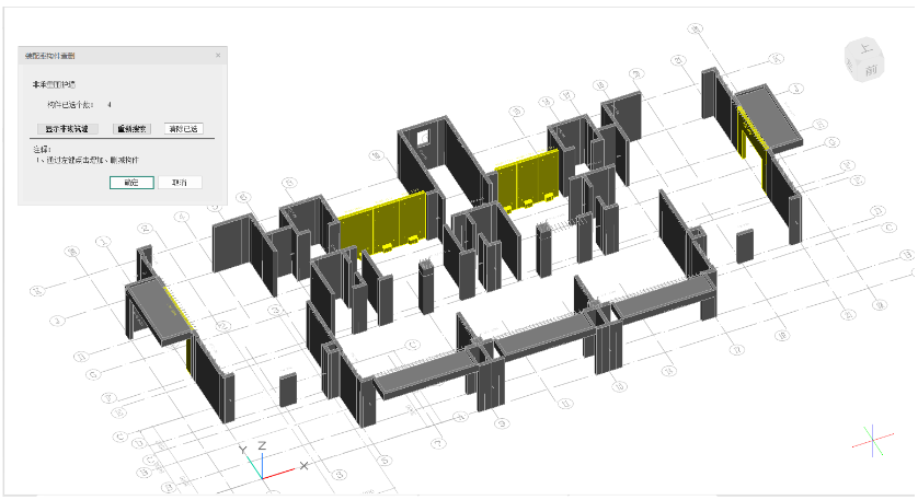1)勾选自动计算,点击“指定非承重围护墙范围”,程序会自动搜索到所有参与计算的非承重外围护构件并显黄,在程序搜索自动结果的基础上,可通过单击构件增减参与计算的构件。若应参与计算的构件,程序未搜索到,则可通过手动单击增加,从而保证该项内容计算的准确性。左上角对话框构件已选个数实时更新选择构件的总数量。点击“确定”返回装配率设置界面,再进行计算。点击“取消”退出选择界面。计算墙体外表面积不扣除门、窗及预留洞口等面积。当模型中创建了砌筑墙体,分子项中不统计该类型墙体表面积。
