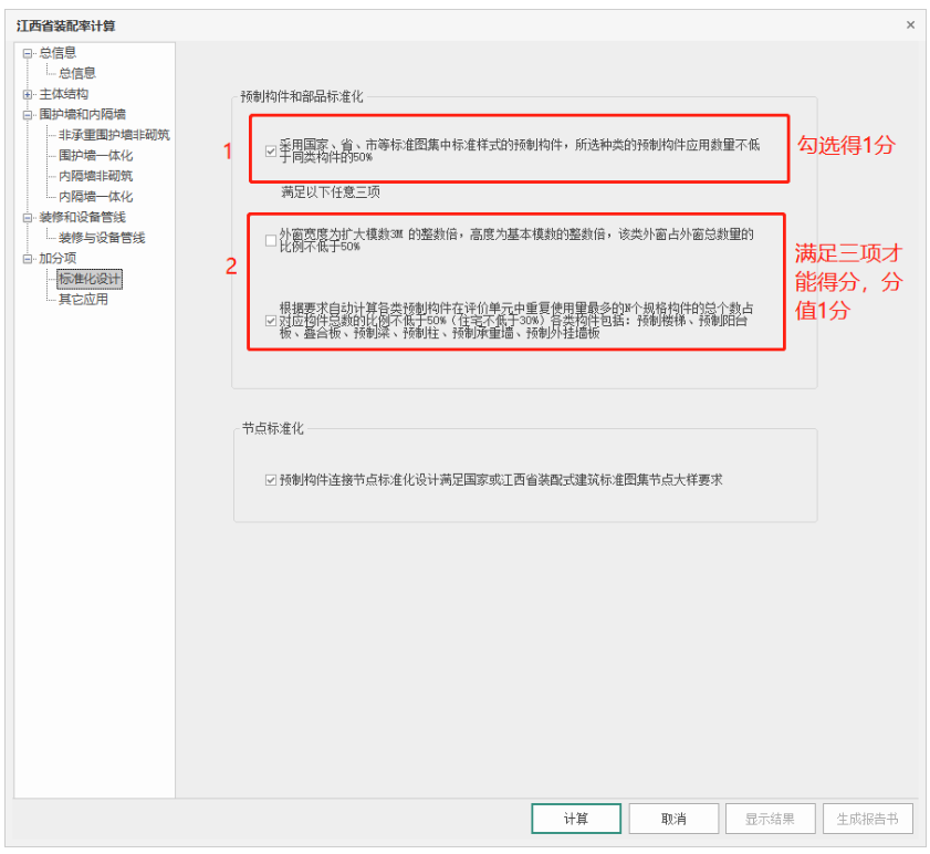注:各选项间互不影响,默认勾选自动计算和节点标准化选项。预制构件和部品标准化最高得1分,不论勾选几个选项。