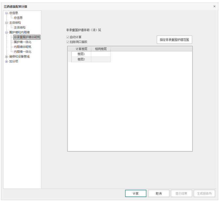 取消勾选“自动计算”,可手动输入非承重围护墙非砌筑墙体表面积和所有非承重围护墙外面总面积,程序根据输入结果计算相应比例和分值。