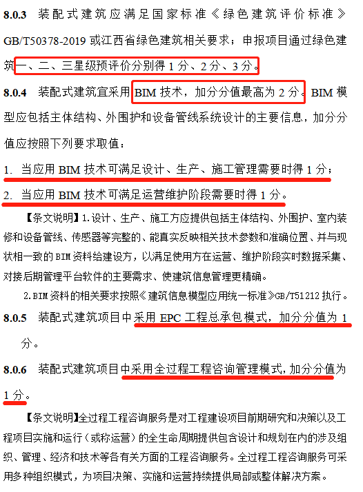 《江西省标》8.0.3~8.0.6条规定【绿色建筑评价标识】、【BIM技术应用】、【施工与管理】得分项,如下图所示: