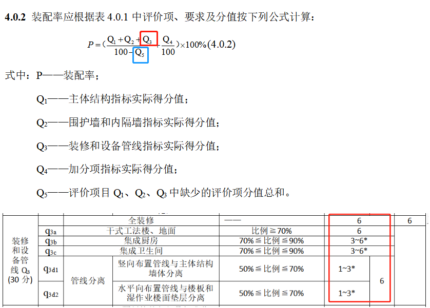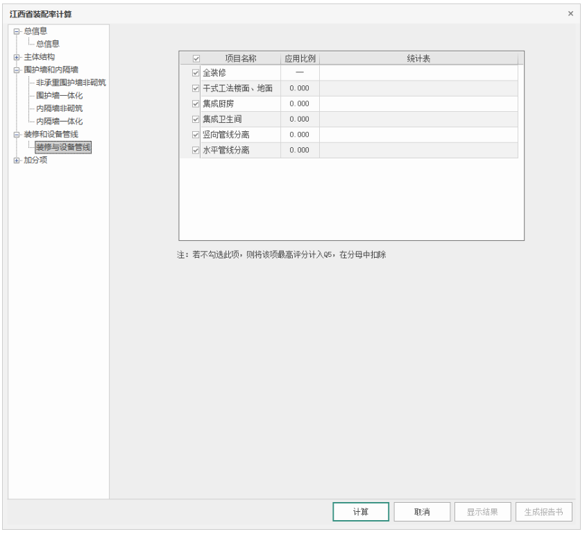勾选,则按比例给分计入分子Q3项;不勾选,则计入分母扣除项Q5中,扣除分值按现有得分的最高分数扣,例如没勾选竖向管线分离,则Q5=3.0。