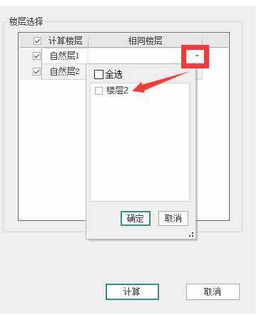 左侧可全选或者勾选计算楼层,右侧可设置相同楼层,即在对应自然层处下拉设置同该计算楼层相同计算