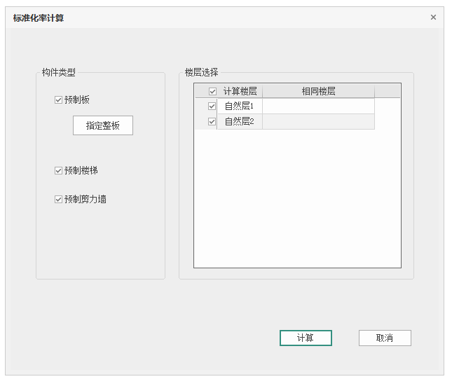 构件类型包括:预制板、预制楼梯、预制剪力墙,默认全部勾选,若取消勾选则不统计该项的标准化率,同时表格不输出该类构件的结果;