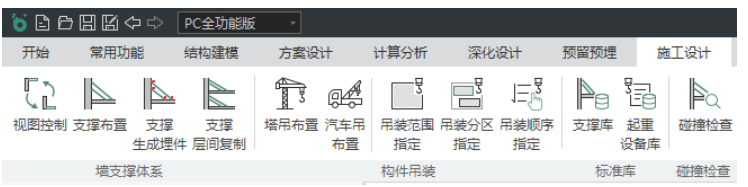施工设计包括墙支撑体系、构件吊装、标准库和碰撞检查四个部分,此部分功能可用于生成斜支撑、斜支撑层间复制、生成斜支撑平面布置图、碰撞检查、塔吊和汽车吊的选型与布置、吊装方案设计和支撑库、起重设备库的管理。