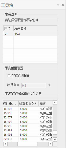 点击【施工设计】-【塔吊吊重验算】弹出工具箱对话框,如下图所示。