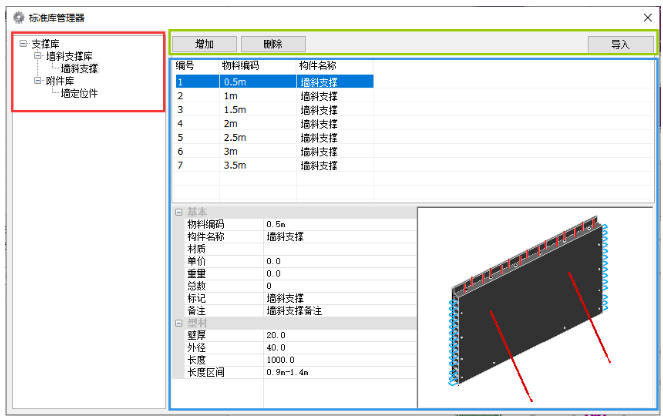 用户可使用【支撑库】功能对程序内的所有斜支撑、墙定位件进行查看和管理,点击【支撑库】,弹出界面如下图所示。下图红框区域显示支撑类型,绿框区域为管理功能,蓝框区域为显示支撑信息列表。