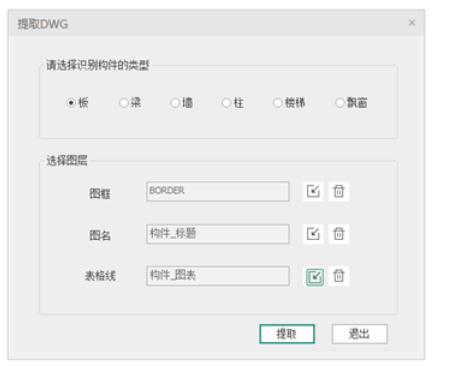 点击【提取BOM信息】按钮,弹出下图所示界面,首先根据详图中的构件类型选择构件。然后选取关键图层,包括图框、图名、表格线,点击提取后完成图纸信息的提取。