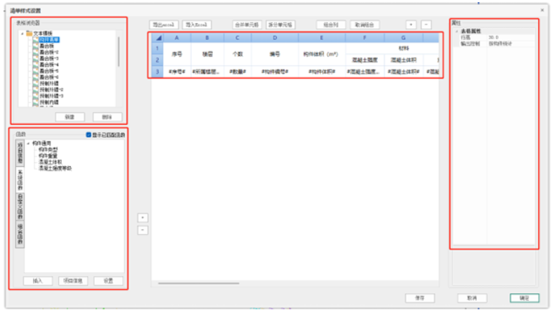点击【配置导出模板】按钮,弹出清单样式设置对话框,对话框如下图所示,分为【表格浏览器】、【函数】、【清单样式表格】、【属性栏】和【公共按钮】5个部分。