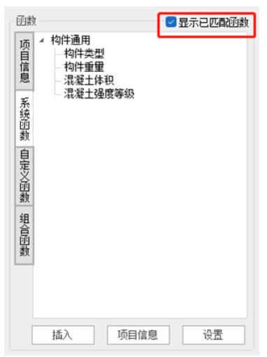 函数按照函数属性默认分为4组,分别是【项目信息】、【构件类】、【钢筋类】和【附件类】。但是后面三个分组之间不存在严格的分界,也不代表函数意义,仅用于函数分组。左侧卷展栏切换会切换【函数列表】中的列示项。