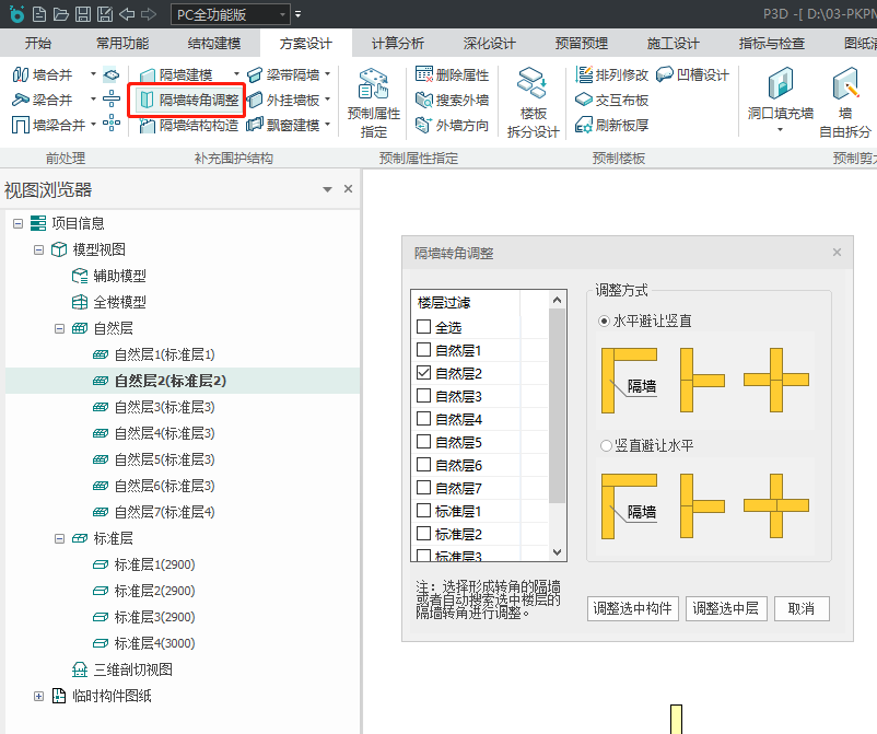 【调整选项】可选择“调整选中构件”或“调整选中层”进行隔墙避让调整。调整效果如下图所示。