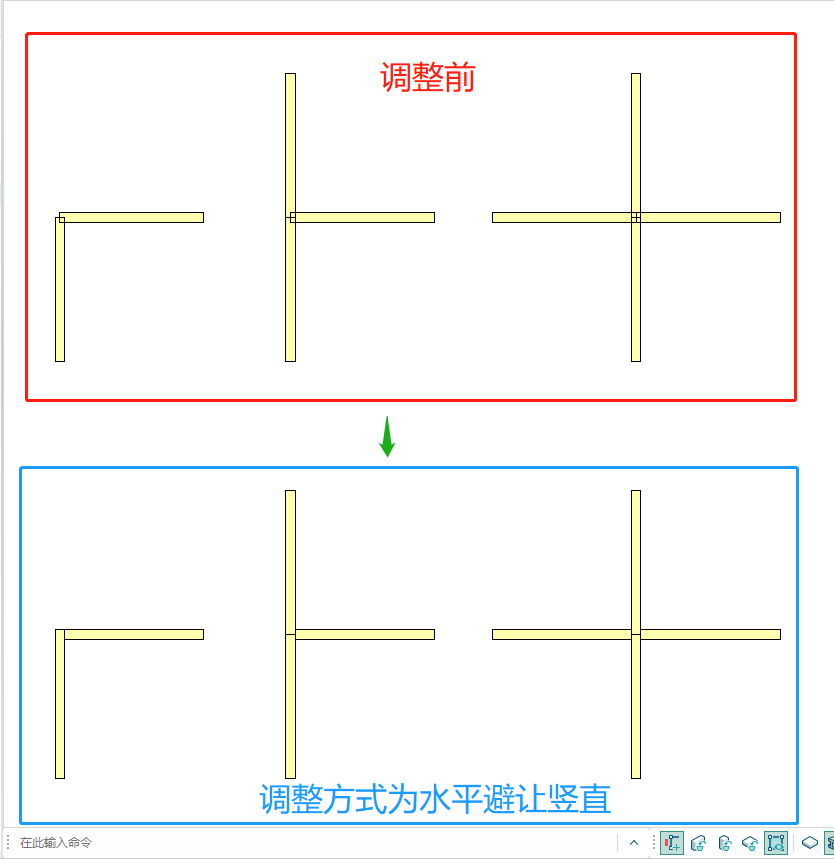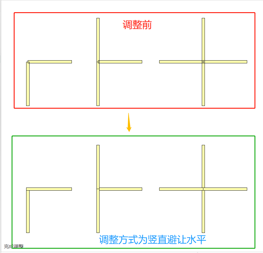 【调整方式】可选择“水平避让垂直”和“竖直避让水平”两种调整方式,不同调整方式的避让情况如参数界面所示。