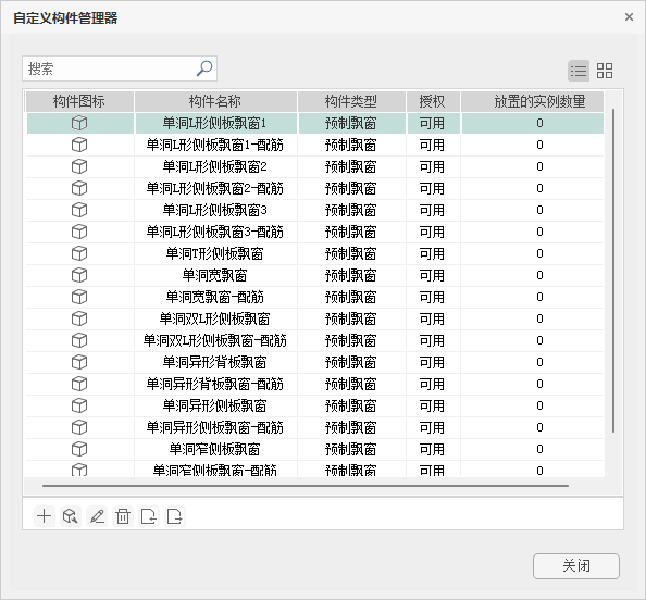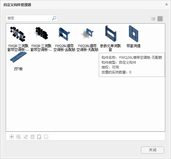 构件管理器界面中的项目构件,可选择“列表显示”和“图表显示”两种状态进行展示。“列表显示”状态下,各项参数平铺展示,包括“构件图标“”构件名称“”构件类型“”授权“”放置的实数量“,如上图所示;在”图标显示“状态下,可将鼠标置于构件图标处,会悬浮出现该构件的参数信息,如下图所示。