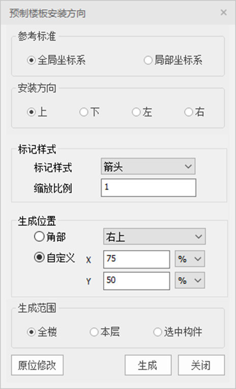 【生成范围】:控制安装方向生成的预制板范围。提供了【全楼】、【本层】和【选中构件】三个选项。