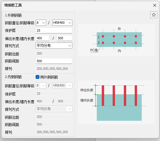 勾选【同外侧钢筋】时,各参数与【外侧钢筋】相同。不勾选时,可对各参数进行调整,参数参照【外侧钢筋】各参数。