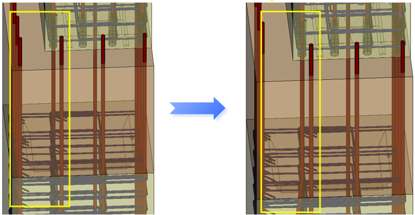 俯视图下,框选或点选上层柱钢筋小圆点(红色),右键确认即可,处理成功后钢筋呈上图黄色框区域,旋转视图查看处理效果如下图所示。