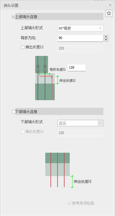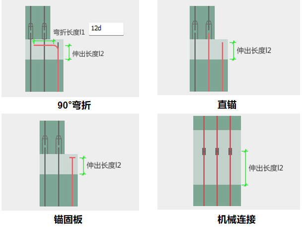 【上部端头形式】:分为【90°弯折】、【直锚】、【锚固板】和【机械连接】四种端头形式。