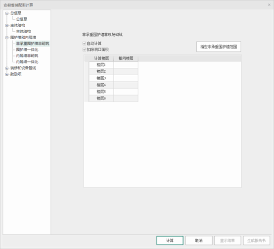 1)勾选自动计算,点击“指定非承重围护墙范围”,程序会自动搜索到所有参与计算的非承重外围护构件并显黄,在程序搜索自动结果的基础上,可通过单击构件增减参与计算的构件。若应参与计算的构件,程序未搜索到,则可通过手动单击增加,从而保证该项内容计算的准确性。左上角对话框构件已选个数实时更新选择构件的总数量。点击“确定”返回装配率设置界面,再进行计算。点击“取消”退出选择界面。计算墙体外表面积不扣除门、窗及预留洞口等面积。当模型中创建了砌筑墙体,分子项中不统计该类型墙体表面积。取消勾选“自动计算”,可手动输入非承重围护墙非砌筑墙体表面积和所有非承重围护墙外面总面积,程序根据输入结果计算相应比例和分值。