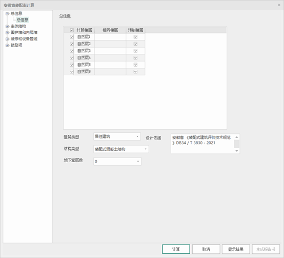 【设计依据】:默认填“《安徽装配式建筑评价技术规范》DB34 / T 3830 - 2021”可修改,此部分联动在word报告书中同步内容,不影响计算方法。