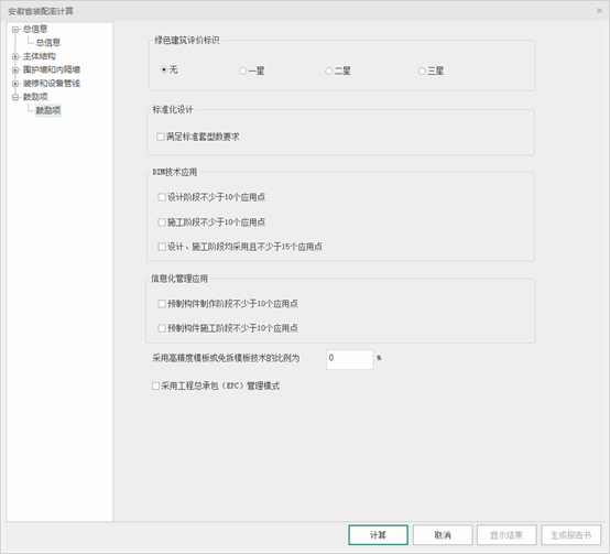 用户根据项目实际情况选择对应工艺做法,根据《安徽省标》各项评分要求,得出最终结果。点击“计算”,直接输出各项结果,可查看和导出为EXCEL文件,功能启动界面如下:
