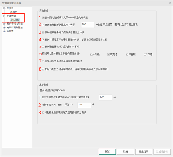 注意:若预制剪力墙包含了外页板、保温层、填充墙、PCF墙体积,则计算书中现浇构件总体积列表中也出现相应列,也就是分子分母同时计算勾选项的体积。只有填充墙特殊处理,详第七条。