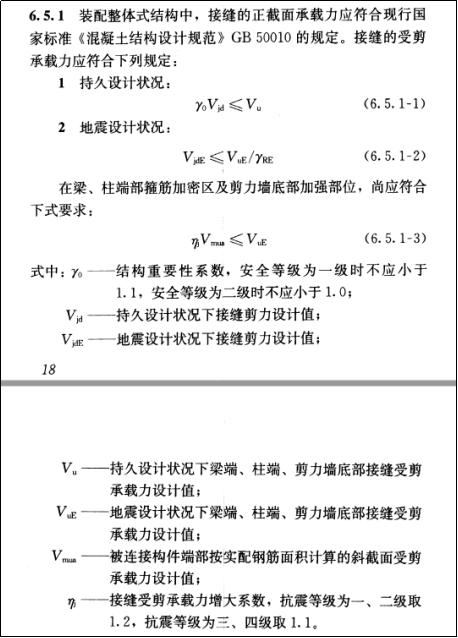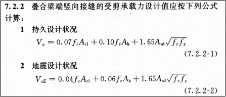 本功能根据《装配式混凝土结构技术规程》JGJ1-2014中6.5.1条和7.2.2条对预制梁端接缝受剪承载力进行验算,并可批量生成word版报告书,参考公式如下图所示: