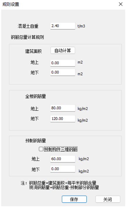 【全楼钢筋量】用户可根据项目情况手动输入全楼每平方米钢筋的预估重量,包含地上和地下两部分,单位kg/㎡(现浇和预制钢筋量的总和)。