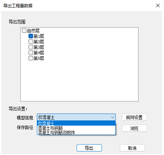 【模型信息】提供仅混凝土、混凝土和钢筋、混凝土与钢筋及附件三种类型供选择。