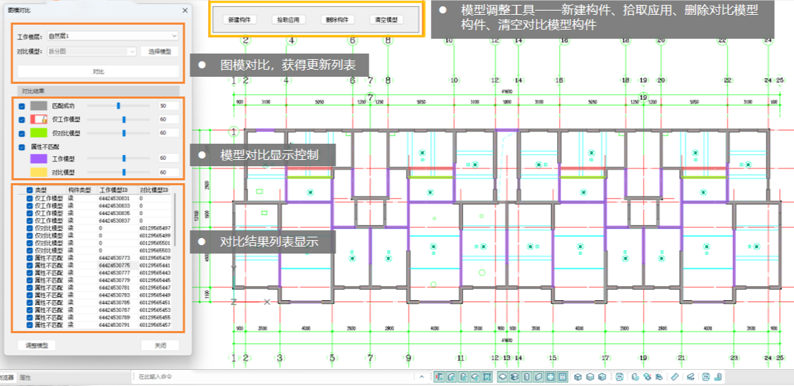 在图纸变更时,快速修改模型并保留构件属性,把原有模型和最新图纸生成的模型一一对比,该功能支持对墙、梁、柱、墙洞的变更修改,点击【方案模块】-【图模对比】弹出如下图所示。