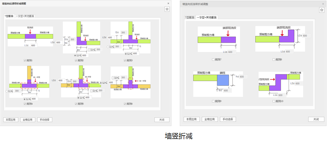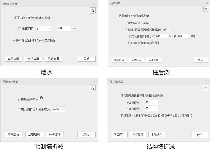 竖向构件包含【墙竖折减】、【墙水】、【柱后浇】、【预制墙折减】和【结构墙折减】,如下图所示。