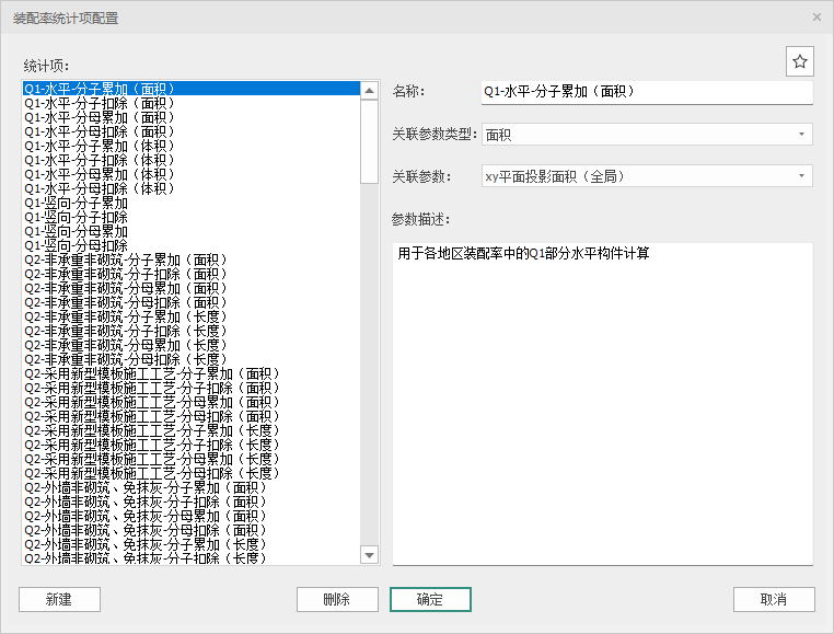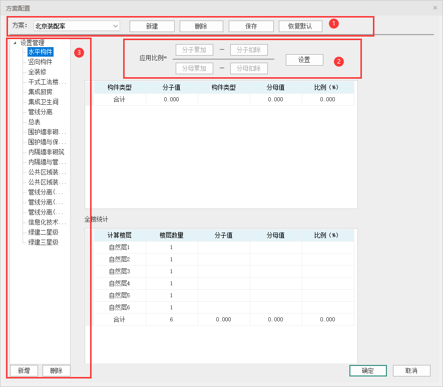 可对装配率方案进行【新建】、【删除】与【保存】,还可直接【恢复默认】。 - 区域②
