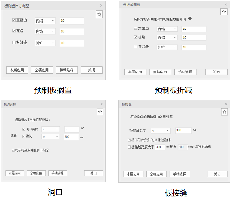 水平构件包含【预制板搁置】、【预制板折减】、【洞口】和【板接缝】,如下图所示。