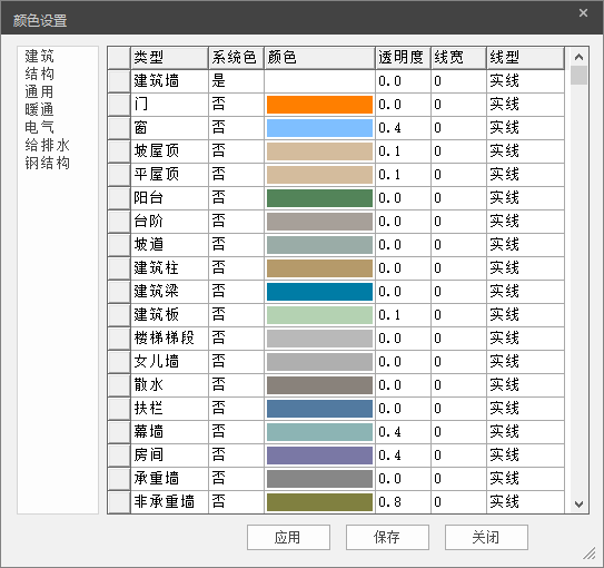 点击【构件颜色】,可对各类构件颜色等进行自定义,设置完成后,点击【保存】,可以将颜色配置方案保存,点击【应用】,可以将配置应用到模型中,如下图所示。