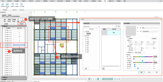 点击【设置】-【构件材质修改】弹出材质修改对话框,该功能需要在自然层进行,且修改及个数统计仅对当前视图范围有效。选择构件后,会在模型上高亮显示改构件。点击【材质修改】弹出材质库对话框,可在该对话框内对构件的材质进行选择和编辑。