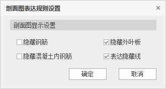 此功能在构件详图内使用,进入构件详图视图后,下拉【补充剖面】-【表达规则设置】,弹出如下图所示对话框,可对补充的剖面图进行显示设置。