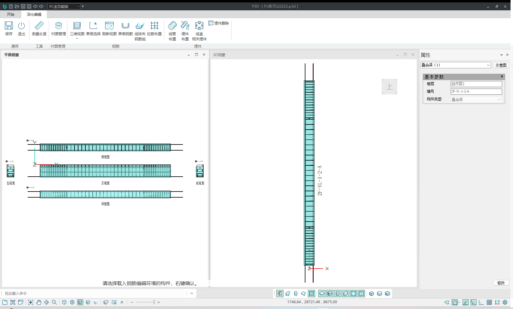 构件深化编辑支持对单根钢筋、钢筋组和拉筋组进行编辑和调整。支持选择环境外布置埋件进行调整编辑。