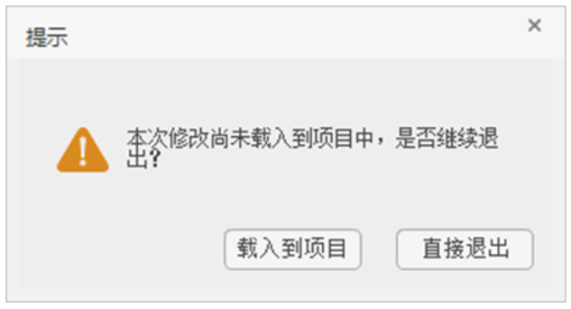 【退出环境】:在完成自定义构件的创建或调整后,点击【退出环境】,会弹出“本次修改尚未载入到项目中,是否继续退出?”的提示,可选择【载入到项目】或【直接退出】。选择【载入到项目】的情况详见3.9.1节,若选择【直接退出】则直接放弃本次进行的所有操作。