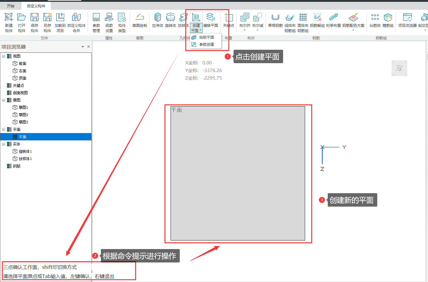 点击【创建平面】后根据左下角命令提示创建自定义平面,如下图所示。