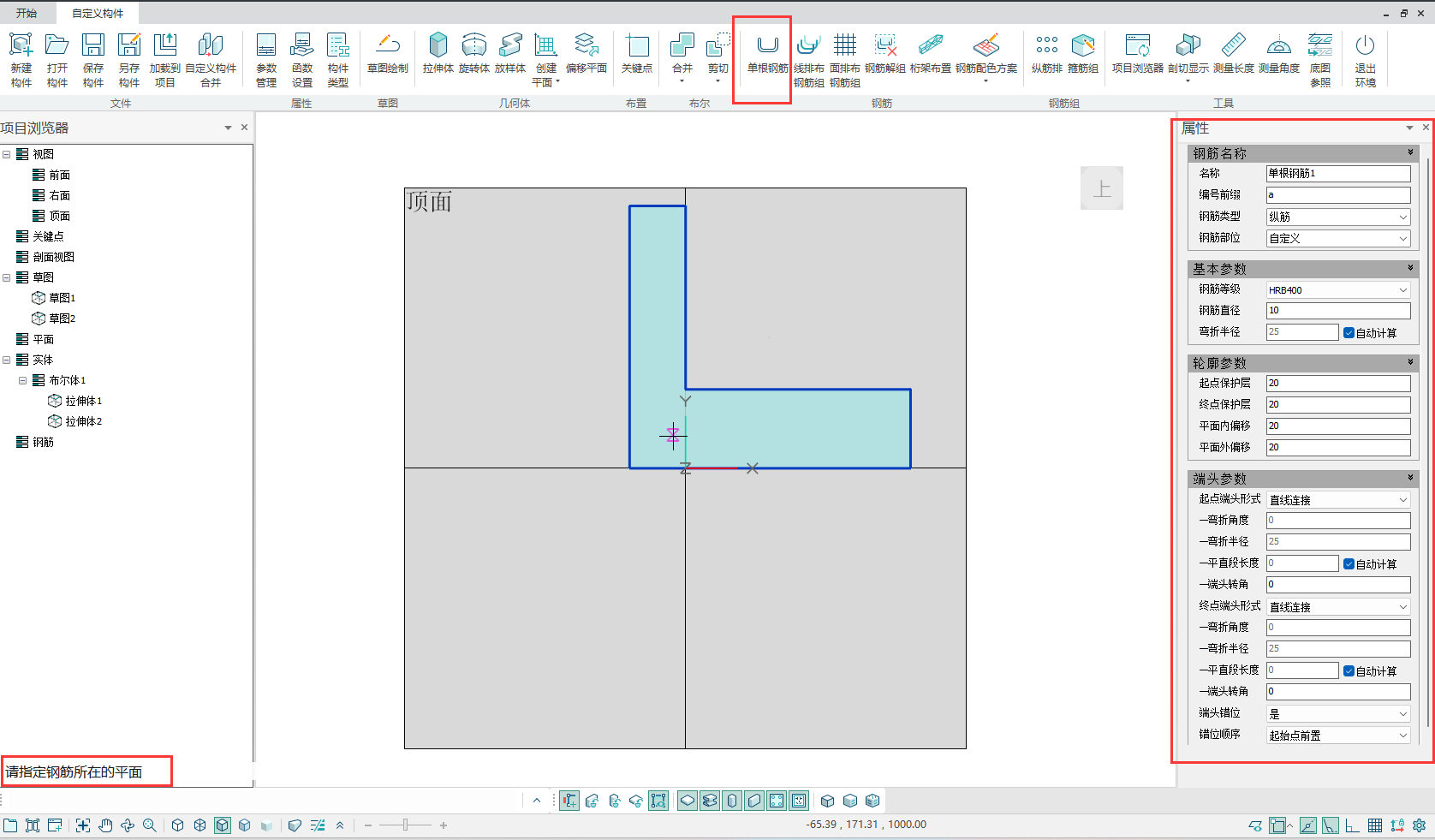 右侧属性栏可修改钢筋等级、直径、弯折半径等基本参数。