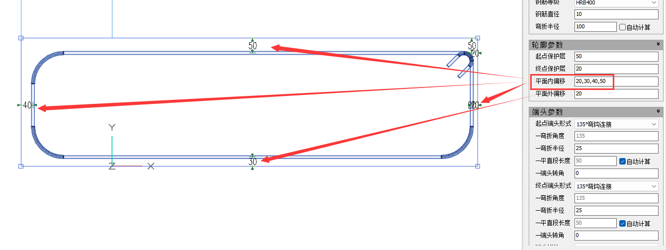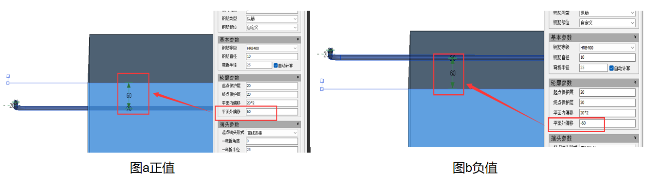 【平面外偏移】:如下图所示,该参数可控制钢筋所在平面与初始选择平面的垂直距离。正值为缩进混凝土轮廓的距离,负值为伸出混凝土轮廓的距离。双击原位标注可以直接修改,同时支持原位标注和属性栏的修改。