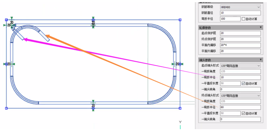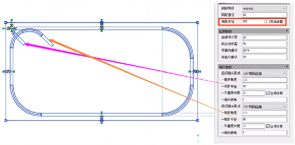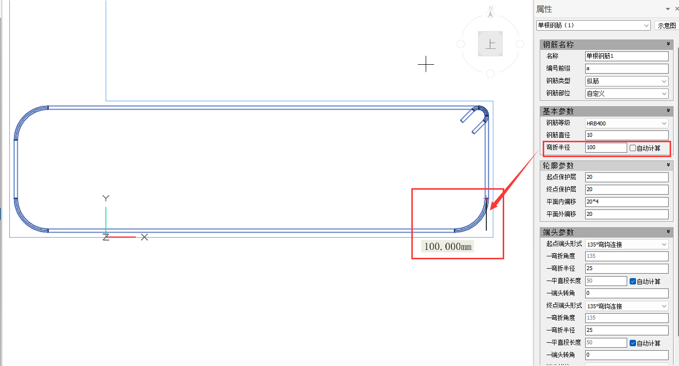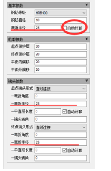 【弯折半径】:如图所示,当取消勾选右侧【自动计算】勾选项时,可对钢筋弯折半径进行修改。分别控制起点端头的和终点端头的弯折半径,具体参数含义同上。