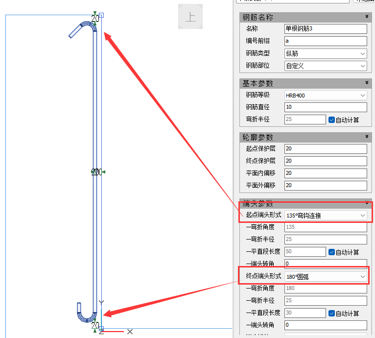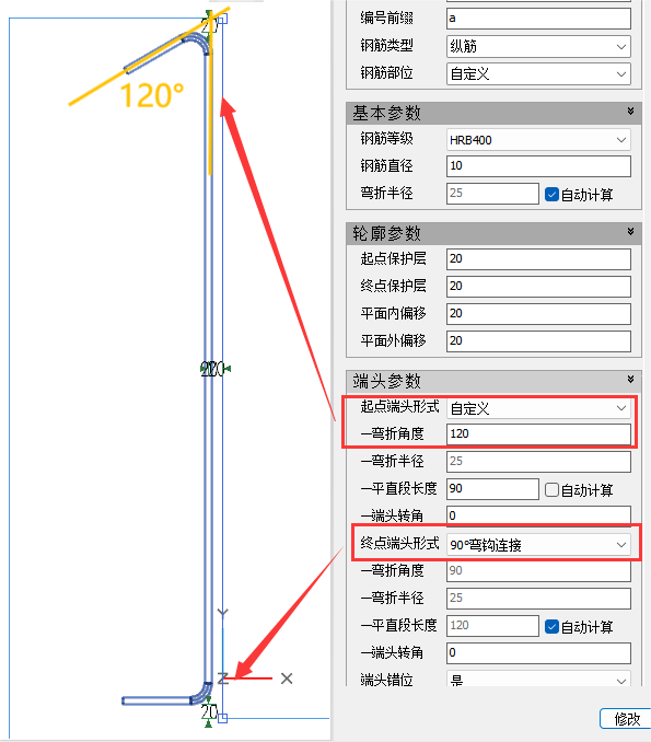 【弯折角度】:当勾选自定义端头形式时,才可进行弯折角度的修改。 输入值对应钢筋端头弯折角度。