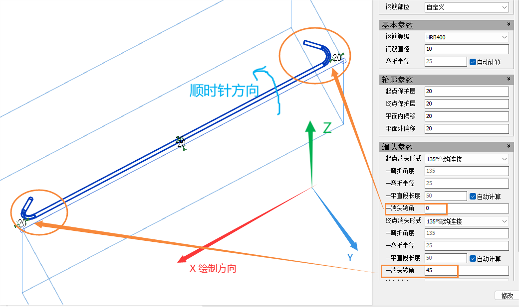 【端头转角】:三维模式下的轴转角参数的控制,判断依据主要为钢筋的绘制方向,按照右手法则确定:默认坐标系中Z轴指出屏幕外,钢筋绘制方向为X轴,按右手定则确定Y轴的方向。以顺时针方向为正确定角度值,目前允许输入值为0-360°,以参考平面为0°。如:当钢筋绘制方向为竖直向下时,以顺时针方向为正进行轴转角的转动。