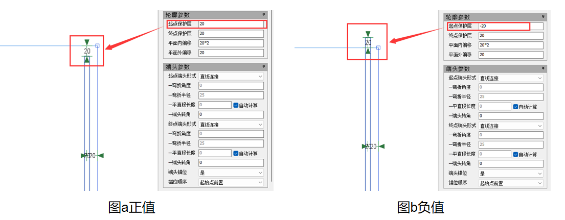 【起点保护层】:用户绘制钢筋第一点朝着第二点方向缩进的尺寸,缩进方向为正,反方向为负值。双击原位标注可以直接修改,同时支持原位标注和属性栏的修改。