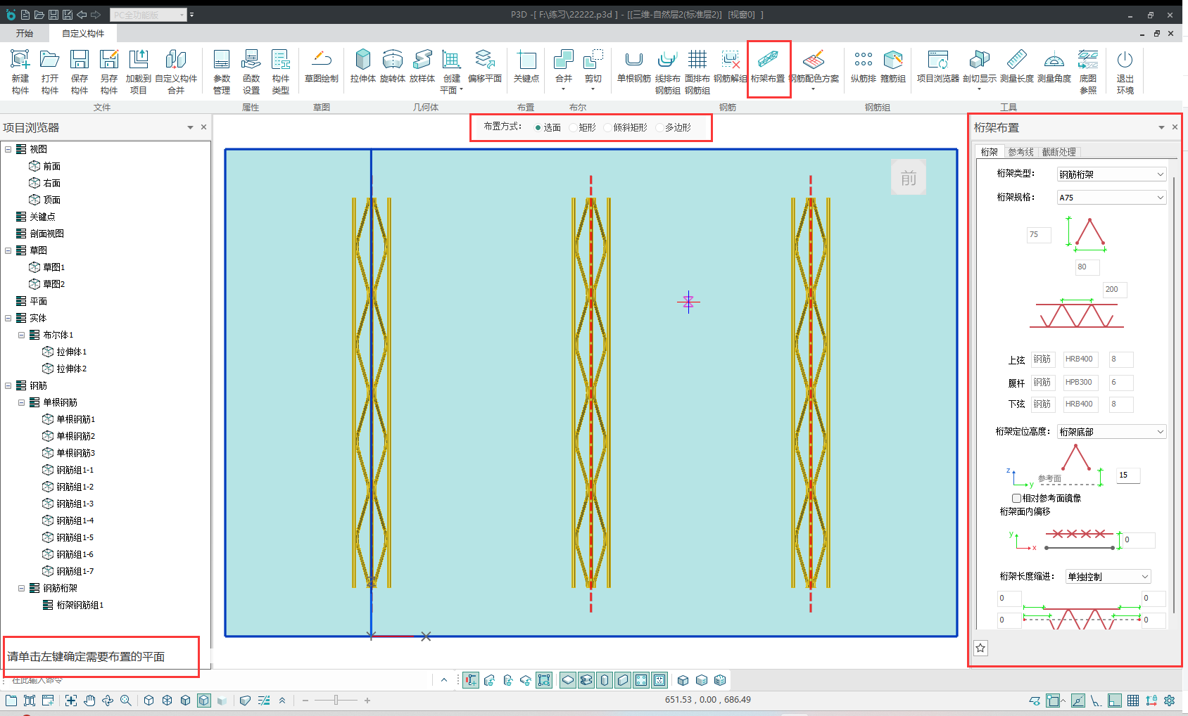 点击【桁架布置】按钮,程序界面左下角有操作步骤的提示。选中桁架筋所在的平面,在此平面上进行桁架筋的绘制。注意该平面为后续参数中的参考平面。